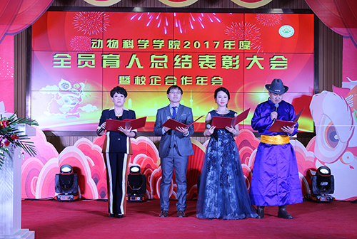 3月16日晚,由动物科学学院主办的2017年度全员育人总结表彰大会暨校企合作年会在新区路演大厅举行。全国肉羊首席科学家金海、自治区农牧业厅饲料处处长高雪峰、自治区畜牧工作站站长红海,我校校长王万义、纪委书记哈斯巴根出席年会。