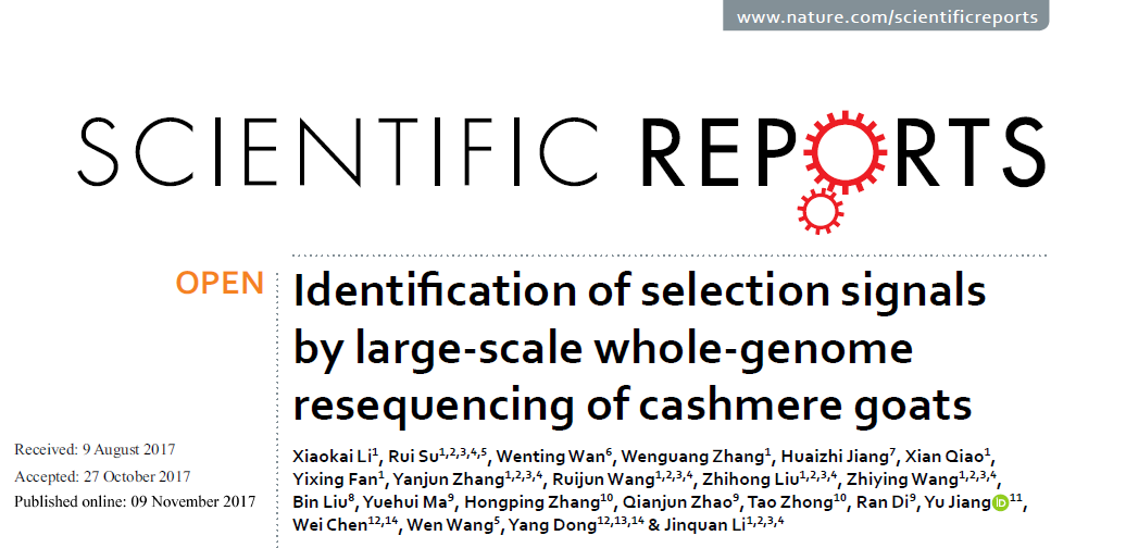 近日,由我校动物科学学院博士研究生李晓凯,教师苏蕊为共同第一作者,李金泉教授为通讯作者完成的科研论文《Identification of selection signals by large-scale whole-genome resequencingof cashmere goats》(《大规模全基因组重测序检测绒山羊的选择信号》),在Nature(《自然》)旗下的《Scientific Reports》(《科学报告》)期刊发表。